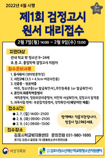 김포시청소년재단 학교 밖 청소년지원센터는 '22년 제1회 검정고시 대리원서접수 지원'을 2월7일부터 2월9일까지 운영한다고 밝혔다.