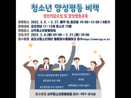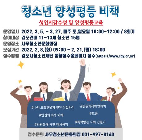 (재)김포시청소년재단 사우청소년문화의집에서는 관내 청소년들에게 청소년기 올바른 성지식 확립과 건전한 성가치관 정립을 위해 특성화프로그램 ‘청소년 양성평등 비책’ 1기를 운영한다.