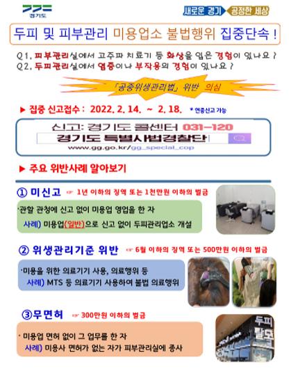 경기도 특별사법경찰단이 최근 탈모환자 증가에 따른 두피?탈모 관리서비스 시장 확대에 따라 2월 14일부터 18일까지 수원, 화성, 용인, 오산, 고양, 파주 6개 지역에서 규모가 큰 가맹점 위주로 두피 및 피부관리 미용업소 90개소를 대상으로 미신고?무면허 등 불법행위를 집중 수사한다.