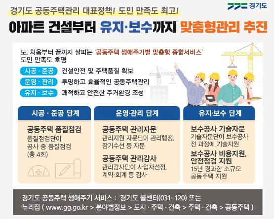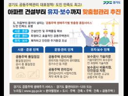 경기도가 공동주택의 시공·준공 단계부터 운영관리, 보수공사, 안전점검 등을 종합 지원하는 ‘공동주택 생애주기별 맞춤형 종합 지원서비스’를 올해도 계속 추진한다.