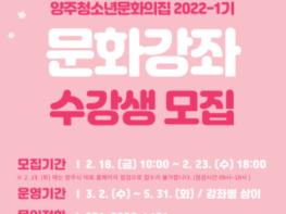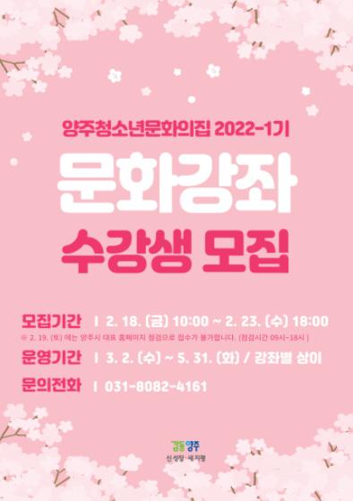 양주청소년문화의집은 오는 18일부터 23일까지 관내 청소년을 대상으로 문화강좌 수강생을 선착순 모집한다고 밝혔다.