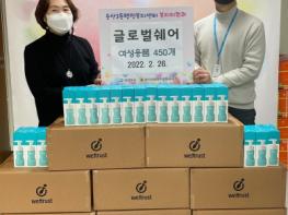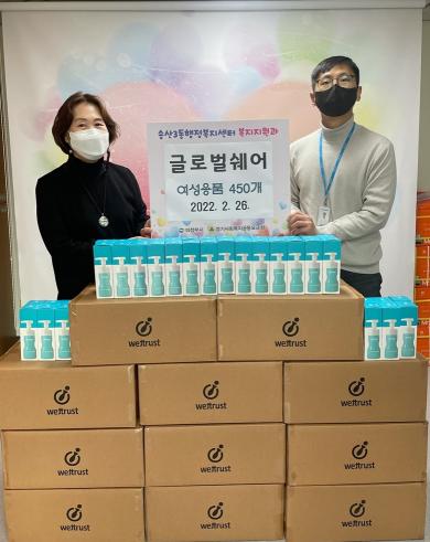 의정부시 송산3동행정복지센터 복지지원과는 2월 16일 사단법인 글로벌쉐어가 이웃돕기 후원물품 여성청결제 450개를 기탁했다고 밝혔다.