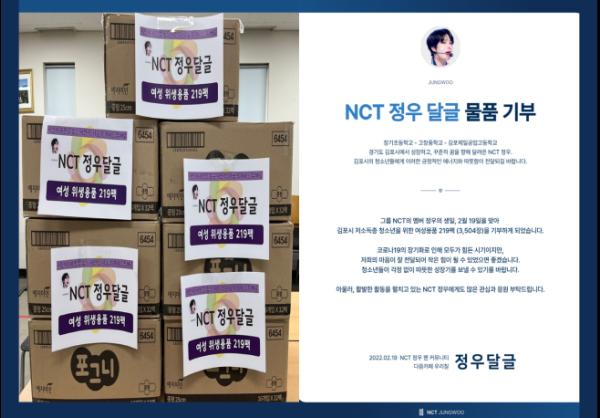 김포복지재단은 최근 아이돌그룹 'NCT' 멤버 정우 팬클럽(NCT정우달글)으로부터 '저소득층 청소년'들을 위한 여성 위생용품을 기부받았다고 밝혔다.
