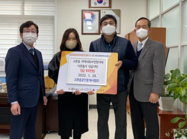 고촌읍 공인중개사연합회(회장 김민중)는 지난 1월 24일 고촌읍지역사회보장협의체(공공위원장 이창우, 민간위원장 김시동)에 이웃돕기 성금 100만 원을 기탁했다.