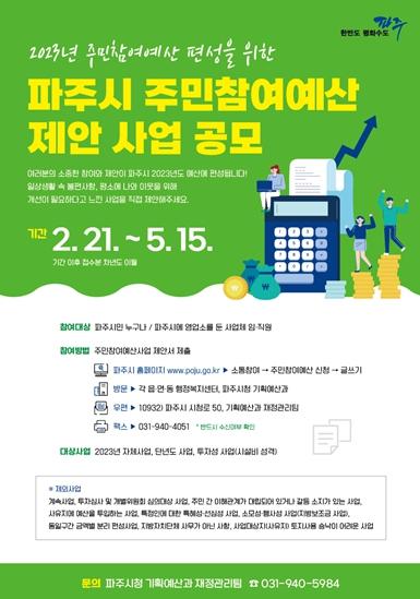파주시는 2월 21일부터 5월 15일까지 2023년도 예산반영을 위한 ‘주민참여예산 제안사업’ 신청을 받는다.