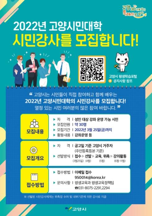 고양시가 '2022년 고양시민대학'의 시민강사 30여명을 오는 3월 25일까지 공개 모집한다.
