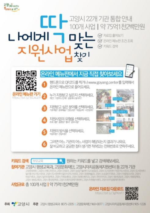 고양시가 시민들이 쉽게 지원사업 정보를 파악하고 이용할 수 있도록 고양시의 교육 기반 22개 기관에서 추진하는 사업을 핵심 정리한 ‘나에게 딱 맞는 지원사업 찾기’온라인 자료집을 발간했다.