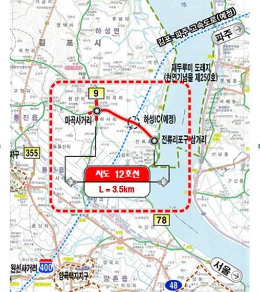 시도12호선 도로 확·포장사업은 하성면 원산리에서 전류리까지의 약3.5km구간의 2차선 도로를 4차선으로 확·포장하는 사업이다. 상대적으로 열악한 김포 북부권 발전을 도모하고, 출퇴근 시 극심한 교통 불편을 해소하기 위해 약 400억 원의 사업비를 들여 2025년 완공을 목표로 하고 있다.