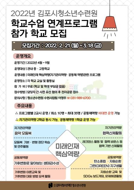 (재)김포시청소년재단 김포시청소년수련원에서는 청소년의 전인적 성장 지원을 위한 신규 사업 ‘학교수업 연계프로그램’을 운영한다.