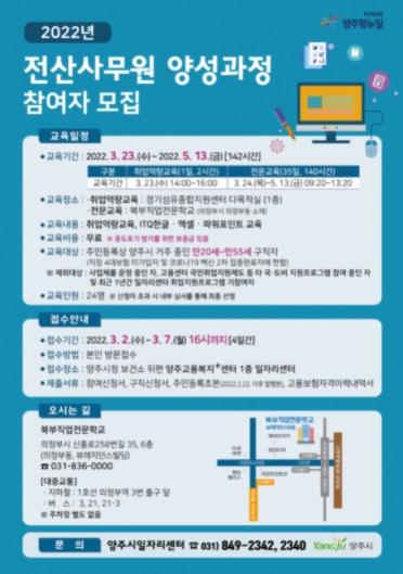 양주시는 오는 3월 2일부터 7일까지 양주시일자리센터에서 운영하는 2022년 취업지원프로그램 '전산사무원 양성과정'에 참여할 수강생을 모집한다.