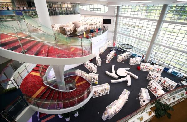 ▷ 1층 아트그라운드는 열람공간과 커뮤니티 공간이 공존하는 광장 콘셉트로 소규모 미팅, 오픈스테이지 프로그램 운영 등 자유롭게 책을 읽고 소통하는 가치를 경험할 수 있다.
