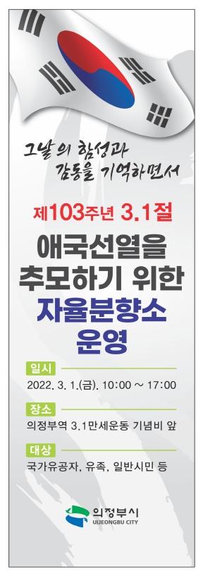 코로나19 오미크론 확산 방지를 위해 제103주년 3.1절 기념식 행사를 할 수 없게 됨에 따라 3.1절을 맞이하여 애국선열의 희생 속에 피어난 희망, 그날의 함성과 감동을 모든 시민들의 마음속에 기억되시길 바라는 마음에 자율적으로 참여하여 분향할 수 있는 시간을 갖도록 한 것이다.
