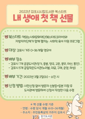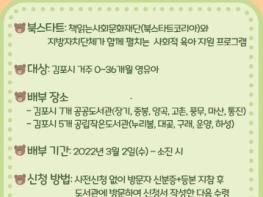 김포시시립도서관은 오는 3월 2일부터 영유아 책 읽기를 위한 북스타트 사업으로 ‘내 생애 첫 책 선물’을 시행한다.