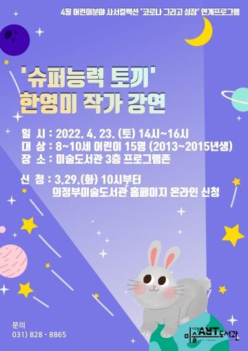 어린이 분야는 4월 23일 오후 2시부터 2013~2015년생 어린이를 대상으로 "슈퍼 능력 토끼" 한영미 작가의 강연을 진행한다. 한영미 작가와 함께 책을 읽으며 두려움을 이기고 성장에 필요한 노력이 무엇인지 생각해볼 예정이다.