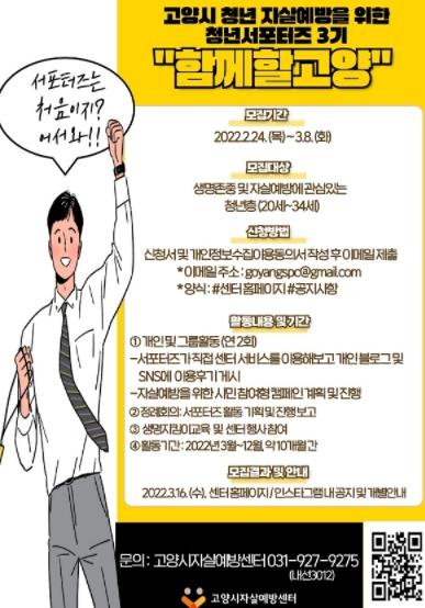 고양시자살예방센터에서 청년층의 생명존중 및 자살예방에 대한 관심을 도모하고 올바른 인식을 가질 수 있도록 활동할 청년서포터즈 3기 '함께할고양'을 2월 24일부터 3월 8일까지 모집한다.