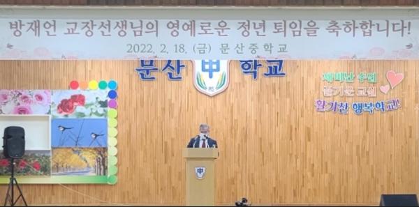 지난 2월 18일 문산중학교 교직원들은 문산중 체육관에서 방재언 교장의 정년퇴임식을 거행하면서“평소 존경하는 교장선생님을 보내드리는 마음이 매우 아쉽다. 그간 교장선생님께 배운 교육자로서의 자세를 항상 잊지 않겠다. 교장선생님의 새로운 앞날을 응원하겠다.”며 아쉬움과 축하의 정을 나누었다.