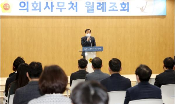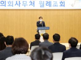 장현국 의장은 2일 오전 의회사무처 대회의실에서 열린 ‘3월 월례조회’에서 “대통령 선거가 바로 다음 주에 있고 지방선거 역시 얼마 남지 않았다”라며 “공직자로서 정치적 중립성을 언제나 유념해 두고 도민을 위한 행정에 집중해야 할 것”이라고 주문했다.