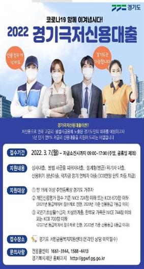 경기도가 생계가 어려운 저신용자에게 최대 300만 원을 저금리로 지원하는 ‘2022년 경기 극저신용대출’ 신청 접수를 3월 7일부터 시작한다.