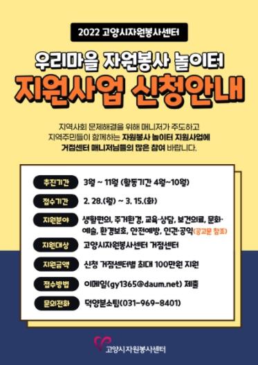 고양시자원봉사센터는 자원봉사 거점센터를 통한 지역사회 문제 해결을 도모하고 자원봉사 활성화를 위한 "2022년 우리마을 자원봉사 놀이터 지원사업"을 공모한다.