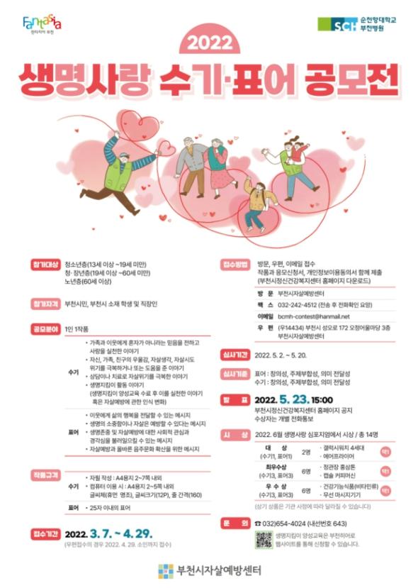 부천시자살예방센터는 생명에 대한 소중함을 되새기고 자살예방에 대한 인식을 높이기 위하여‘2022 생명사랑 수기·표어 공모전’을 실시한다.
