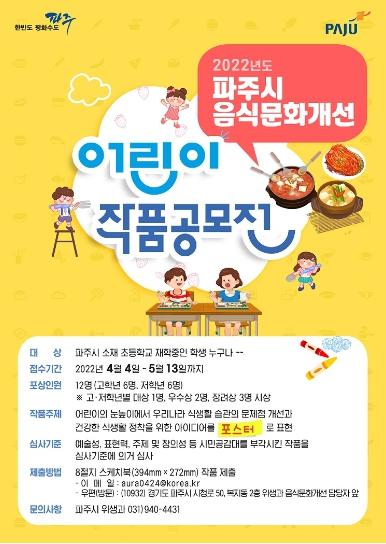 파주시는 관내 초등학교에 재학중인 학생을 대상으로 음식문화개선 작품공모전을 실시한다고 밝혔다.