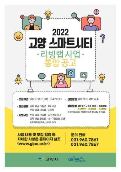 고양시와 고양산업진흥원은 시민과 함께 고양시 도시 문제를 발굴하고 발굴된 문제를 첨단 ICT(정보통신기술) 기술을 적용하여 해결하는 리빙랩 사업 추진을 위해 수행기관(기업)을 모집한다.
