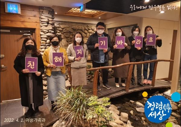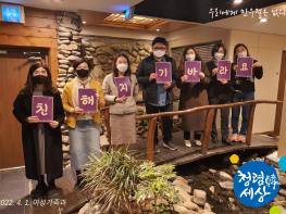 의정부시 여성가족과는 4월 1일 공직 내 청렴문화 조성을 위한 부서 내 자율적 시책으로 ‘친해지기 바라’를 실시했다. 반부패·청렴도 향상을 위해 여성가족과는 부서 내 팀별 소모임(7급 이하 직원, 임기제·공무직 포함)을 구성해 실무자들의 자유로운 청렴에 관한 소통 문화 소모임을 마련했다.