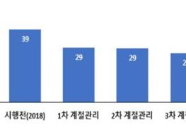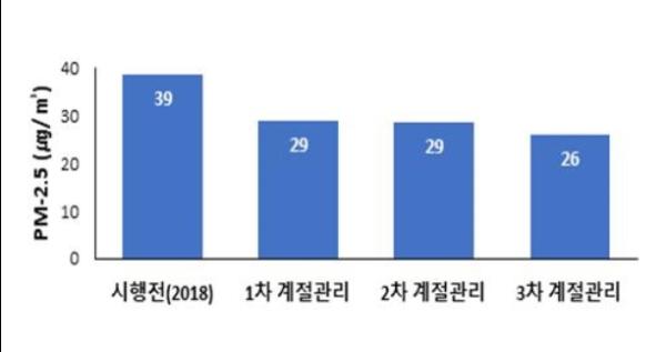 경기도보건환경연구원에 따르면 도내 초미세먼지(PM-2.5) 평균 농도는 계절관리제 시행 이전인 2018년 12월~2019년 3월까지 39㎍/㎥에서 1차 시행 2019년 12월~2020년 3월 29㎍/㎥, 2차 시행 2020년 12월~2021년 3월 29㎍/㎥, 3차 시행 2021년 12월~2022년 3월 26㎍/㎥로 지속 감소했다.