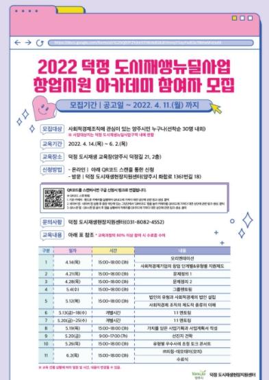 양주시 덕정 도시재생현장지원센터는 오는 11일까지 ‘덕정 도시재생뉴딜사업 창업지원 아카데미’에 참여할 시민을 모집한다.