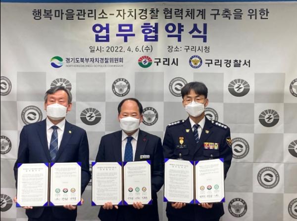 신현기 경기도북부자치경찰위원회 위원장은 6일 오전 구리시청에서 차종회구리부시장, 정한규 구리경찰서장과 함께 이 같은 내용의 ‘행복마을관리소-자치경찰 협력체계 구축을 위한 업무협약’을 체결했다.