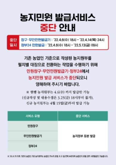 이에 따라, 부천시 등 전국 지자체의 새올행정시스템을 통한 민원 창구와 무인민원발급기를 통한 농지원부 발급은 오는 14일까지 일시 중단 후 4월 15일부터 재개된다.