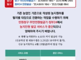 오는 15일부터는 모든 농지에 대해 개별 필지별로 농지원부를 작성하도록 제도가 변경됨에 따라, 4월 7일부터 8일간 전산시스템 변환 작업을 진행한다.