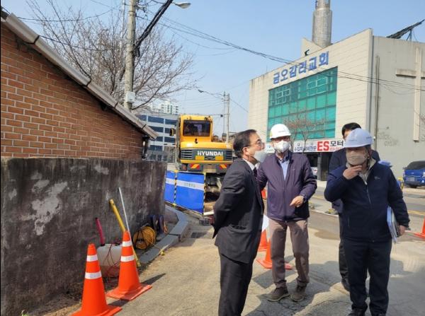 금오배수구역 하수관로 정비공사, 노후 하수관로 정비사업 시공 현장을 방문해 현장 내 근로자와 보행 시민의 안전을 위한 조치가 제대로 시행되고 있는지 작업을 지켜보며 안전관리 이행 현황을 확인했다.