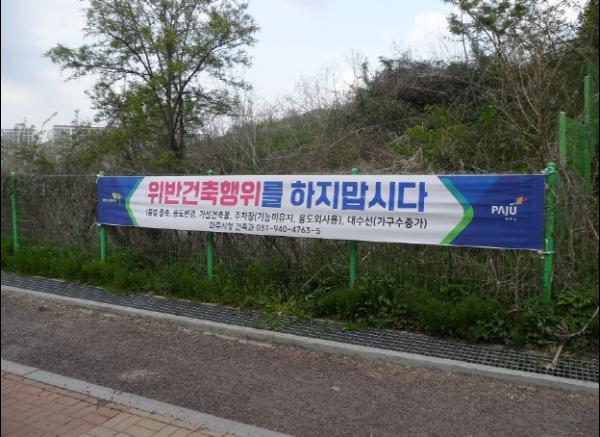 이에 파주시는 2개반 총 5명의 점검반을 편성해 단속하며, 주요 단속 행위는 가구 수 증설, 테라스 증축, 주차장 무단 용도변경 및 조경 훼손이며, 경미한 위반사항은 현지 시정조치 할 예정이다.