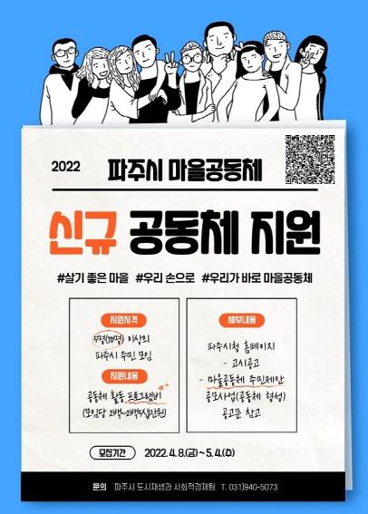파주시는 오는 5월 4일까지 ‘2022년 파주시 마을공동체 주민제안 공모사업’에 새로 참여할 신규 마을공동체를 공개 모집한다고 밝혔다.