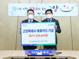 제휴카드 적립기금은 고양시가 지난해 사용한 법인카드, 보조금카드, 공무원복지카드 실적에 따라 일부(0.1∼1.0%)를 적립한 수익금이다. 시는 전달받은 적립기금을 지역발전과 복지 증진에 사용할 계획이다.