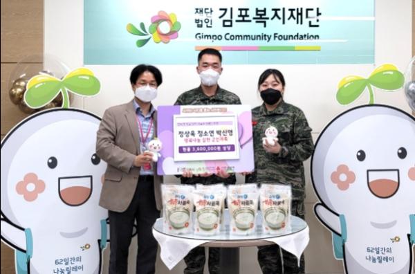 이병우 김포복지재단 대표이사는 “나라를 지켜주는 고마운 군인의 신분으로 어려운 이웃들을 위해 매년 기부까지 실천하고 있어 정말로 의미가 남다르다”고 감사의 뜻을 밝혔다.