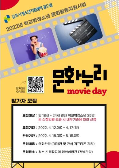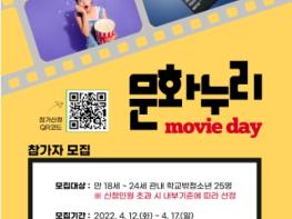 이번 4월부터 진행되는 ▲상반기 문화누리-무비데이는 개별체험활동으로 운영된다. 학교밖청소년들의 심리적 적응도와 삶의 변화속에서 검정고시 등 학업에 대한 스트레스와 학업중단 후 갖게 되는 진로 불안감, 고립된 생활등 해소를 위해 관내 만18세~24세 학교밖청소년 25명을 대상으로 영화관람 문화체험 활동을 지원할 예정이다.
