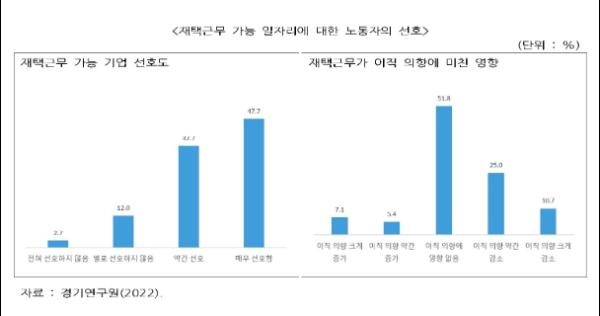 최훈 경기연구원 연구위원은 “노동자는 재택근무를 중요한 복리후생으로 인식해 선호하기 때문에 재택근무 미시행 중소기업의 인력난이 심화할 가능성이 있다”며 “인사노무관리 부담, 생산성 하락 우려, 인프라 구축 비용 부담 등의 어려움을 호소하는 중소기업을 대상으로 재택근무 관련 종합지원을 시행할 필요가 있다”고 말했다.