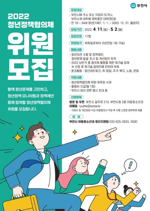 부천시는 청년이 공감하는 도시를 만들기 위해 ‘부천시 청년정책협의체’로 활동할 청년 17명을 5월 2일까지 공개 모집한다.
