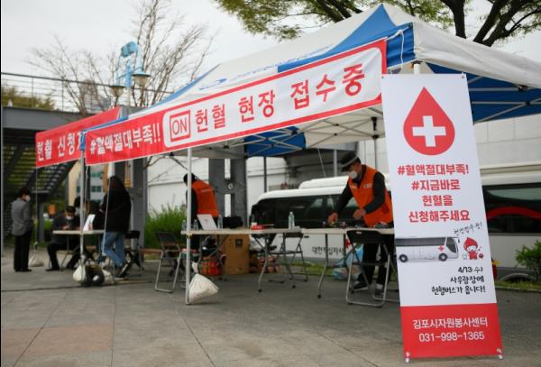 김포시자원봉사센터(센터장 박현숙)에서는 4월 13일 헌혈의 날에 사우문화체육광장 자원봉사센터 앞에 헌혈버스를 배치하고 긴급 헌혈캠페인을 실시했다.