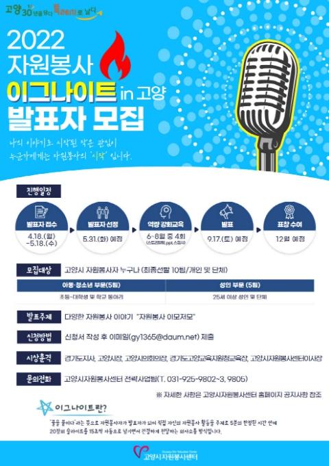 고양시자원봉사센터에서는 오는 18일부터 다음 달 18일까지 '2022 자원봉사 이그나이트 in 고양'에 참가할 발표자를 모집한다고 밝혔다.