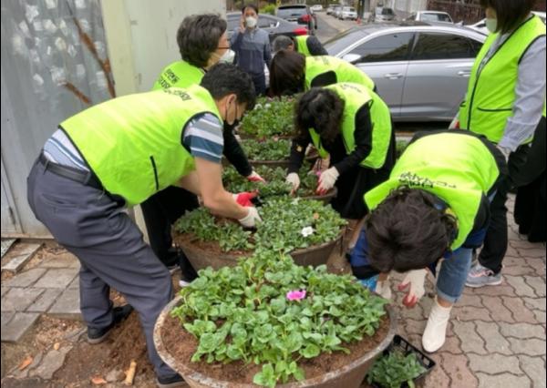 조경순 주민자치회장은 이번 초화식재를 통해 동 행정복지센터 외벽 석면제거 공사로 자칫 어수선해질 수 있는 마을 미관을 봄꽃으로 정비함과 동시에 거리에 새봄의 활력을 불어넣을 예정이라고 밝혔다.