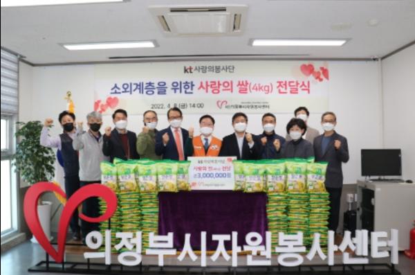 KT의정부지사는 의정부시 자원봉사자 및 시민들을 위하여 의정부시자원봉사센터의 사업 및 프로그램에 다양한 후원들을 지속하여 오고 있으며, 이번 쌀 후원을 통해 지역사회 소상공인 및 소외계층 지원을 동시에 진행하여 지역사회의 긍정적인 평가를 받고 있다.