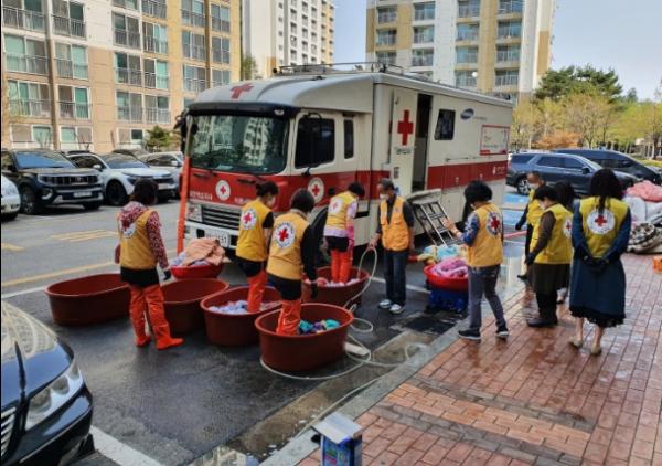 이날 행사에는 송미애 양주2동장, 적십자봉사회 회원 등 10여명이 참석한 가운데 대한적십자사 의정부봉사관의 이동 세탁 차량을 지원받아 이불 40여 채를 수거하고 세탁하여 배달했다.