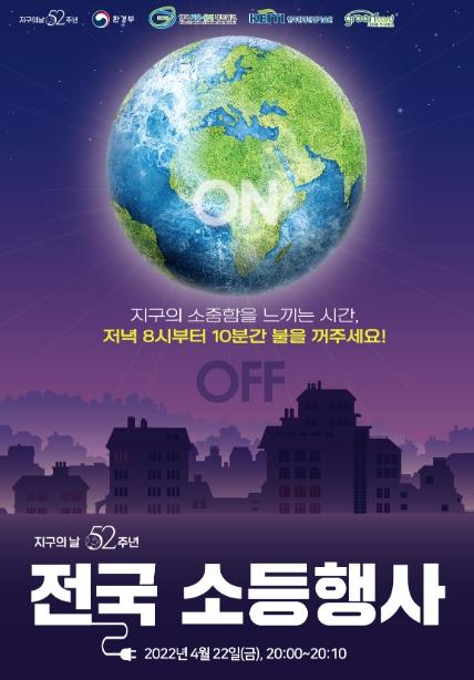 시는 ‘지구를 위한 실천 : 바로 지금, 나부터!’를 슬로건으로 기후변화주간 내 ‘52주년 지구의 날’을 기념해 전국적으로 시행하는 소등행사 캠페인을 추진한다.