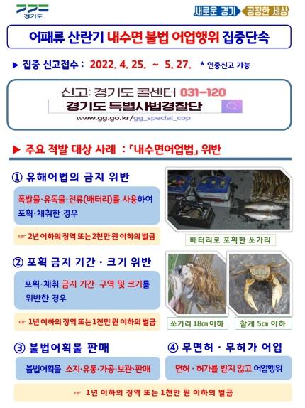 경기도 특별사법경찰단이 내수면 수산자원 보호와 어업 질서 확립을 위해 4월 25일부터 5월 27일까지 도내 주요 강?하천?호수 등에서 불법 어업 행위를 집중 수사한다.
