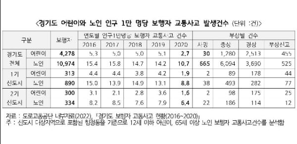 보행자 교통사고를 도내 신도시로 한정해 분석하면 1기 신도시(분당, 일산, 중동, 평촌, 산본)는 4,333건(인구 1만 명당 연평균 6.9건), 2기 신도시(판교, 동탄1·2, 한강, 위례, 운정, 회천·옥정, 광교, 고덕)는 2,091건(인구 1만 명당 연평균 3.7건)으로 나타났다. 노인과 어린이 보행자 교통사고에서 1기 신도시(노인 890건, 어린이 313건) 보다 2기 신도시(노인 334건, 어린이 300건)에서 교통사고가 적게 발생했다.