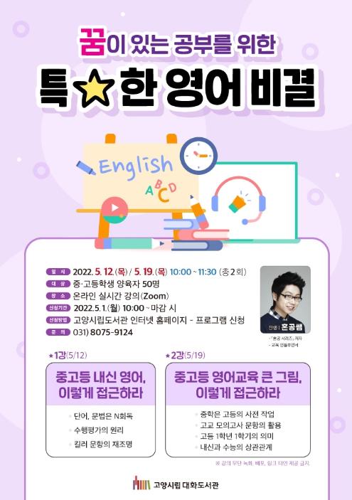 고양시 대화도서관은 오는 5월 12일 목요일 오전 10시부터 학부모 대상 진로독서 프로그램'꿈이 있는 공부를 위한 특별한 영어 비결'을 온라인으로 운영한다.