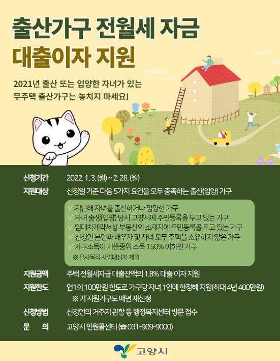 시는 무주택 출산가구의 주거비 부담을 경감하고 안정된 주거환경 조성을 위해 2022년 처음으로 '고양시 출산가구 전월세자금 대출이자 지원사업'을 시행했다.